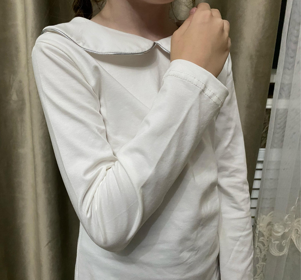 Дизайн модели дополнен кантом с серебряным люрексом по краю воротника, который придаёт лёгкий блеск и делает блузку более нарядной. Классический воротник сохраняет строгий стиль, соответствующий школьному дресс-коду, а застёжка на пуговицу сзади облегчает надевание и добавляет аккуратный декоративный элемент в спинке изделия.